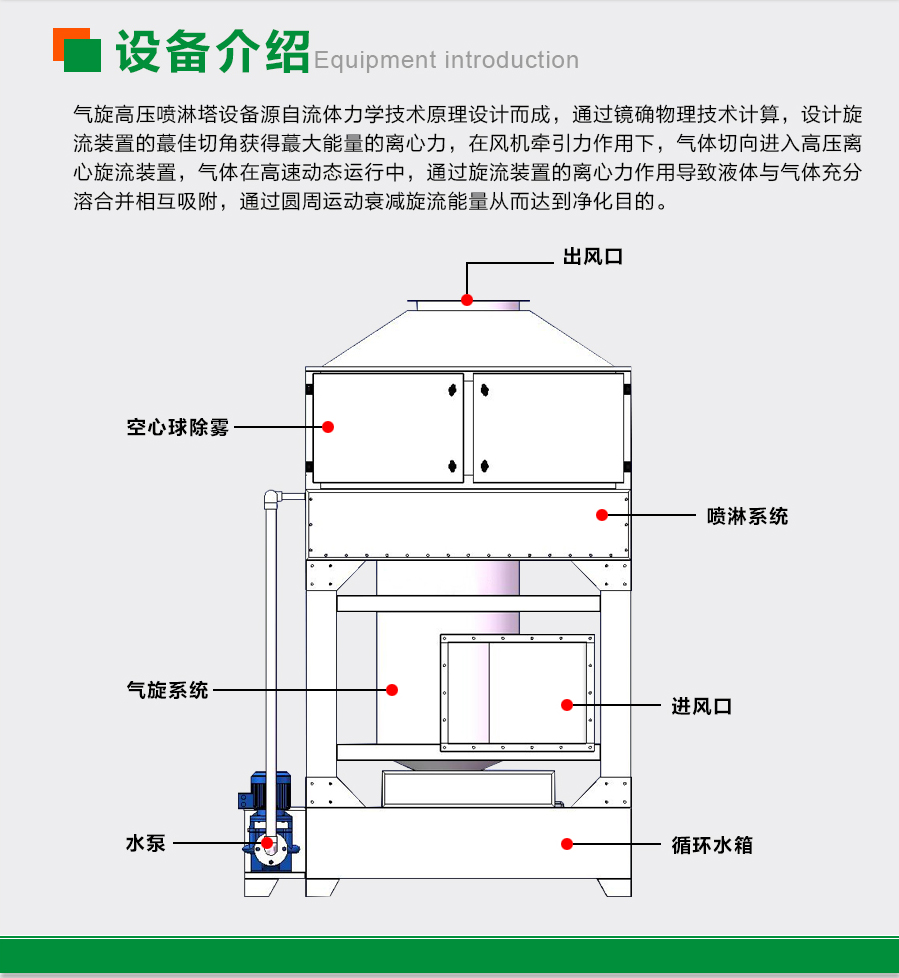 雙級氣旋噴淋塔利用氣體與液體之間的接觸進行氣液分離。氣體中的污染物傳送到液體中,與液體充分接觸洗滌,它能有效分離氣體中含塵含味物質(zhì),降低氣體溫度,凈化污染氣體,達到清凈空氣的目的。