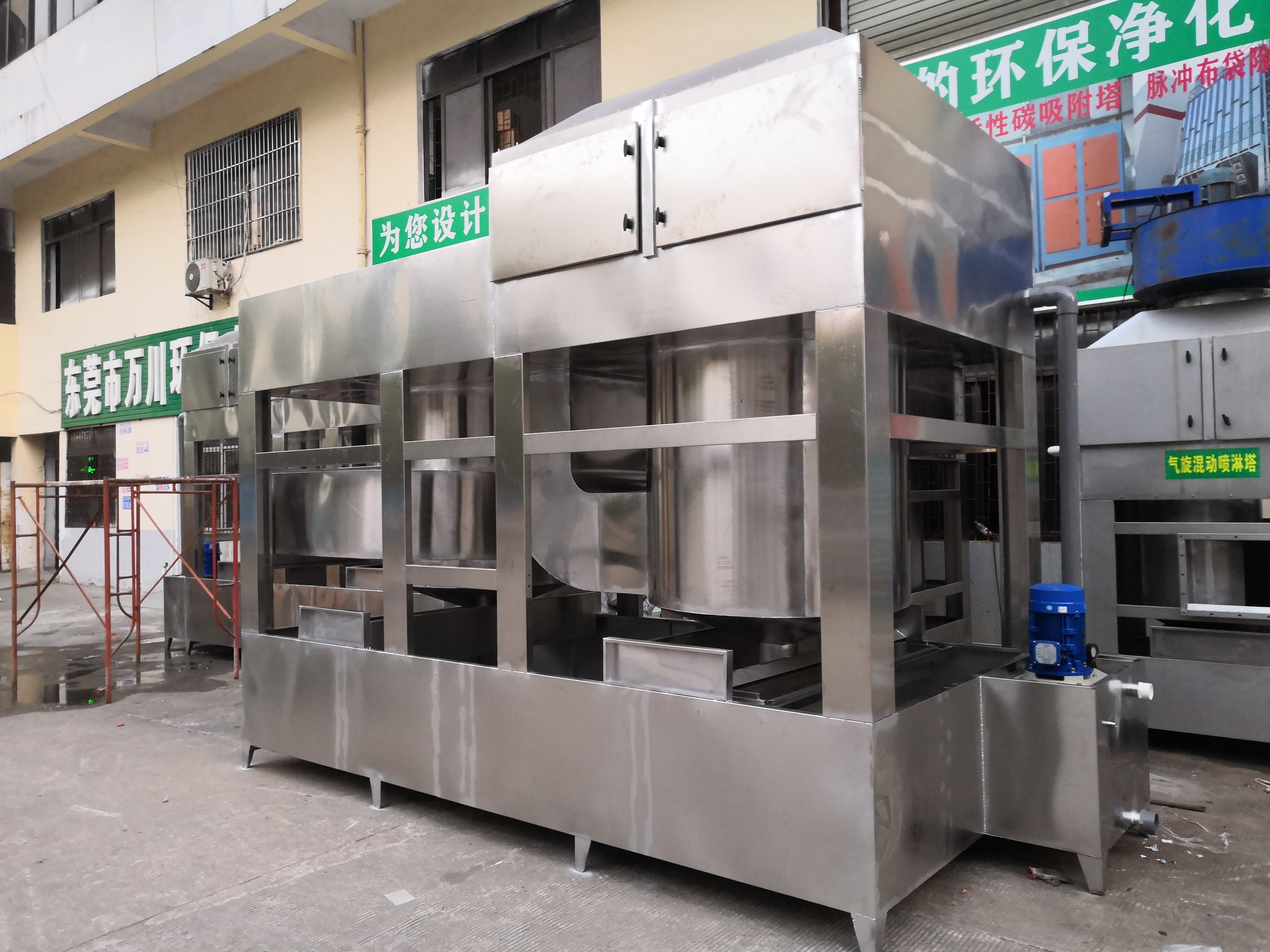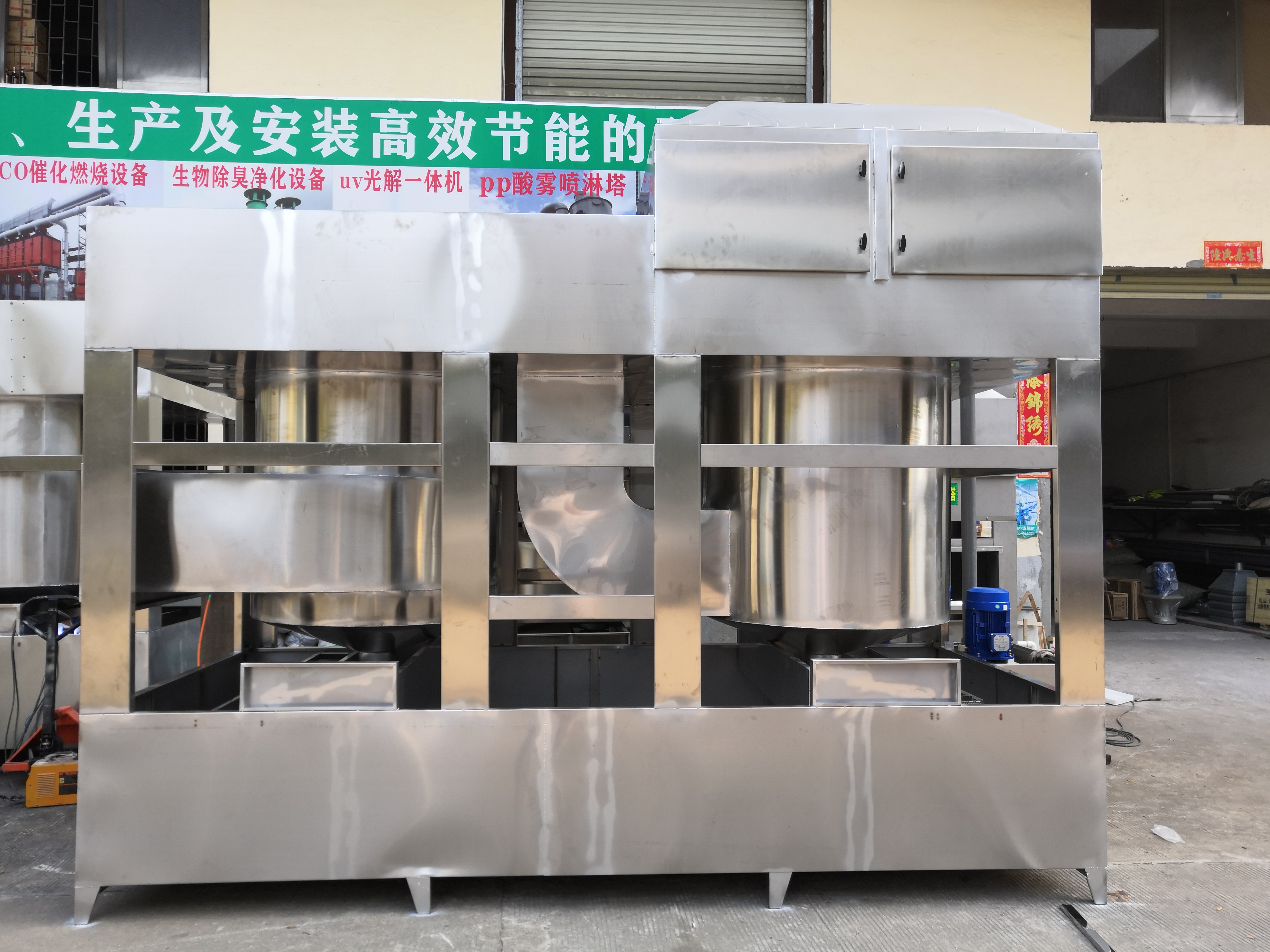 含塵含味氣體通過吸氣罩收集,在風機的作用下,經(jīng)過管道輸送負壓進入雙級氣旋噴淋塔。氣旋混流裝置快速運轉(zhuǎn),多級連續(xù)的凈化使得含塵含味氣體與水霧充份混合,在離心的作用下達到氣液分離。氣旋桶內(nèi)部采用水泵循環(huán)給水,水在水箱經(jīng)水泵增壓后自螺旋噴嘴霧化而出,最后回流至水箱循環(huán)使用。分離出來的雜物下沉到水箱底部,經(jīng)凈化后的氣體進入填料隔水層,然后由風機排出。