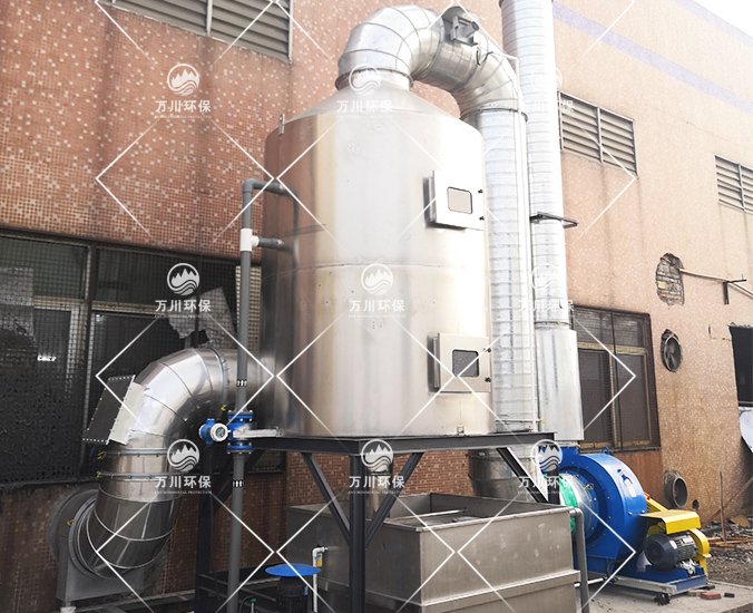 拋光機高速運轉中,粉塵沿著切線方向以負壓的形式被集氣罩吸入至濕式除塵器內,氣體通過塔板螺旋上升,液流從盲板分配到各葉片上形成薄膜層,同時被氣流噴灑成液滴。液滴隨氣流運行的同時被離心力甩至塔壁,形成沿壁旋轉的液環受重力作用而沿壁下流。室內的噴嘴噴出的液滴及塔壁上形成的液膜向下運動,液滴、液膜通過慣性、攔截、擴散等效應將塵粒捕集下來,噴淋室產生的含塵廢水經短時沉淀、格網過濾后進入循環水池,用泵再打入塔內繼續除塵,以節約用水。最后氣體經過防爆除塵風機達標排放。
