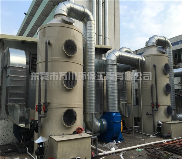 根據氨氣具有易溶于水的特點,氨氣可以使用噴淋塔處理。氨氣廢氣從風管進入噴淋塔,經過噴淋層,噴淋頭不斷的向下噴水,由下到上不間斷地噴水,氨氣的濃度越來越低,最后達標排放,收集起來的氨水還可以重新利用。