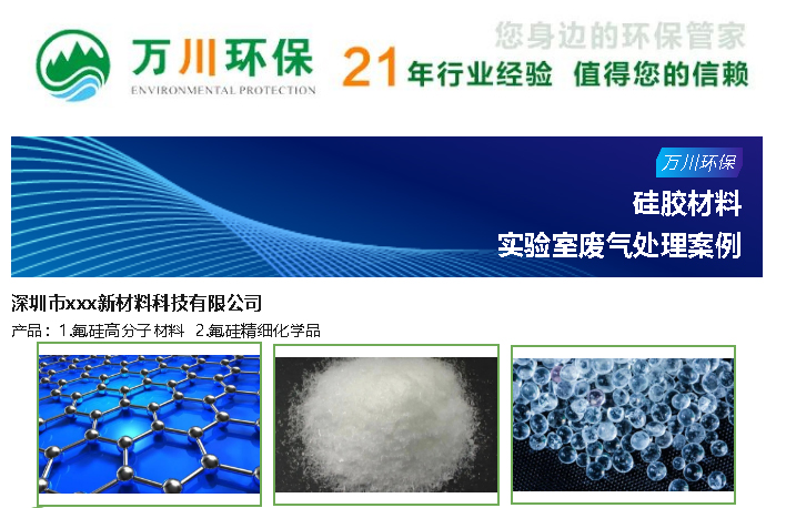 簡介: 深圳市xxx新材料科技有限公司,是國家高新技術企業,致力于氟硅材料的研究及開發30余年。萬川環保受邀對硅膠材料實驗室廢氣進行處理。本文介紹了硅膠材料實驗室廢氣處理中說使用的設備與方案。